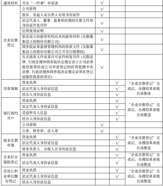 “企业开办”6项联合办理事项:包括营业执照、印章、社会保险、税务、住房公积金单位缴存登记、银行预约开户。