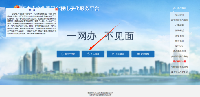 已注册过“掌上登记”的经营者,直接点击“个人登录”,使用本人已登录的“掌上登记”APP扫码,登录成功,系统自动跳转至业务办理界面。