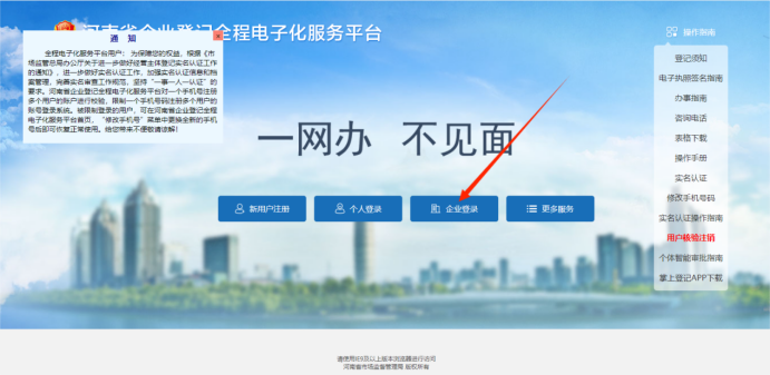 一、电脑上浏览器搜索并打开“河南省企业登记全程电子化服务平台”(http://qcdzh.scjg.henan.gov.cn/index.action)如下图。