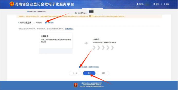 四、在注销便利化界面中。简易注销方式有两种:普通注销和简易注销。根据实际情况勾选即可。然后勾选同意,并提交。