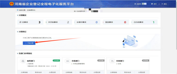 六、清税证明开具之后,税务部门会同步变成已办理。个体工商户无需发布注销公告,直接点击开始办理即可。
