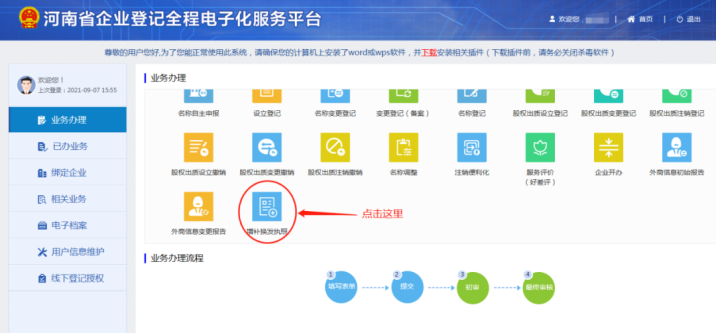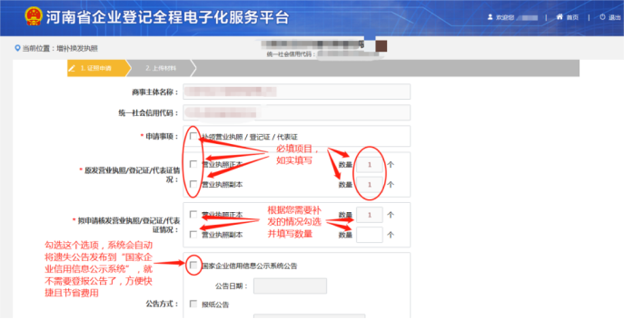 点击下一步进入到营业执照增补换发业务办理界面。勾选补领营业执照、营业执照正本副本、数量填1;勾选国家企业信用信息公示系统公告,就会显示出公告日期。对此页面进行全屏截图,在提交注销申请时一并上传至其他材料内。