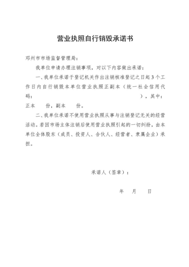 营业执照自行销毁承诺书在邓州市市场监督管理局官网上下载。