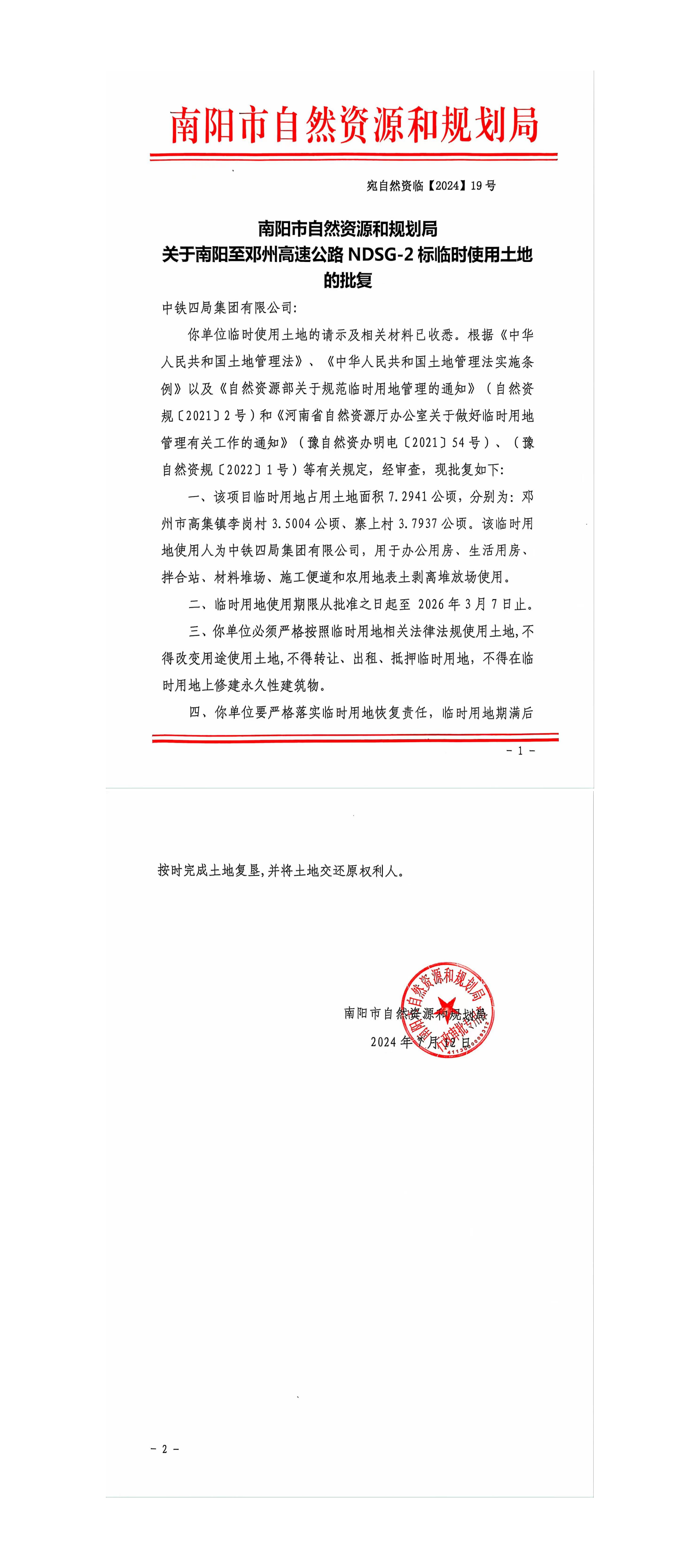 关于南阳至邓州高速公路NDSG-2标临时使用土地的批复