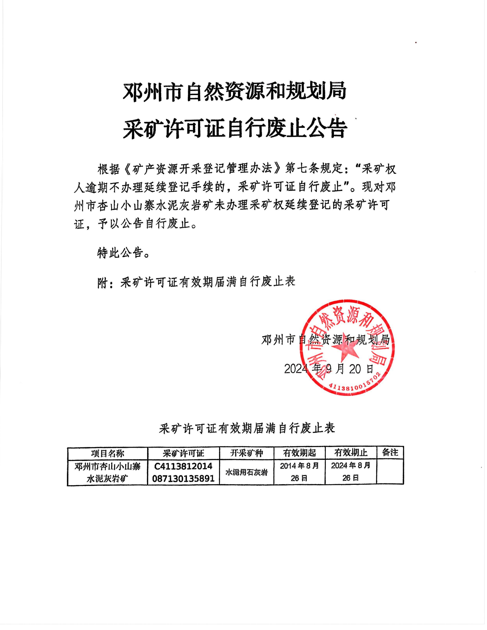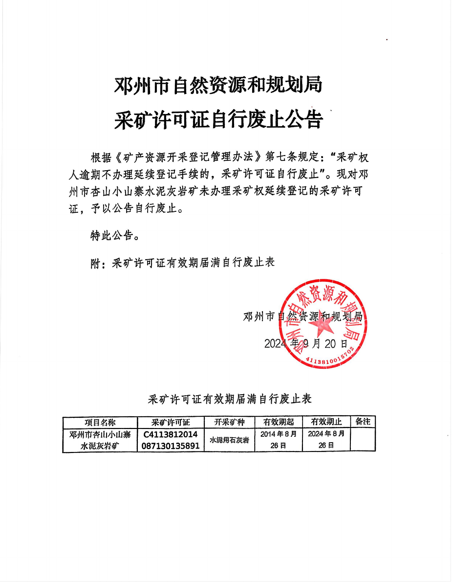 邓州市自然资源和规划局采矿许可证自行废止公告