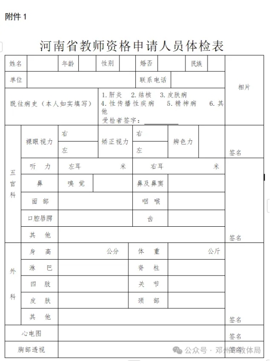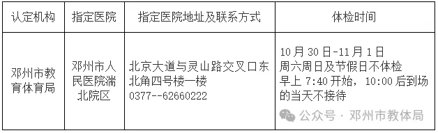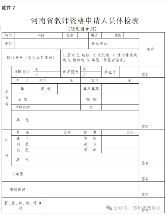 3. 体检要求申请人携带身份证原件、体检表一份(详见附件1、2)和与教师资格网上传照片为同一底版的本人近期一寸免冠照片一张。所有申请人需要在体检表右上角写明3项信息:①本人身份证号②报名号③网上报名时选择的认定机构。如果体检不合格,按医嘱复查,复查仅一次机会。复查必须是初检的体检医院,申请人不得自行更换体检医院。体检结果为不合格的,申请人不得再次更换医院进行体检。体检相关情况由体检医院负责解释。体检结论由医院统一报送各级认定机构,无需申请人再去医院领取。4. 体检注意事项(1)体检当天早上空腹(禁食、禁水)。体检前一天要保持足够的睡眠,忌酒,限高糖、高脂、高蛋白饮食,避免使用对肝、肾功能有影响的药物。(2)妊娠期的申请人可免检孕妇不宜的体检项目,在其他可检测项目合格的情况下,视为体检合格,但须由主检医生在体检表上签署妊娠情况说明。申请人在提交体检合格证明时须附上妊娠反应为阳性的检测报告或围产检查档案等证明材料。(3)要求申请人进站体检携带身份证,做好个人防控,减少聚集,确保体检有序顺利开展,参检人员在体检现场听从工作人员指导意见,体检期间自觉保持距离,不扎堆,不聚集。(4)体检费用按照指定医院收费标准收取。(三)审核中国教师资格网采用数据比对方式核验申请人是否符合认定条件,认定机构在收到体检结果后进行网上审核,给出认定状态。1. 网上审核申请人于体检后5个工作日后,查看认定状态,显示“待认定审批”的,无需现场审核;认定机构留言需至现场审核,或申请人属以下五类情况之一的,需携带相关材料现场审核:(1)学历信息“未核验”的申请人,提供学历证书原件、《中国高等教育学历认证报告》或学历证书电子注册备案表(在学信网(www.chsi.com.cn)在线申请),幼师、中师等中职学历提交中等职业教育学历认证报告(河南省内中职毕业生可在河南政务服务网(www.hnzwfw.gov.cn)在线申请);(2)普通话信息“未核验”的申请人,提供普通话水平测试等级证书原件;(3)持居住证申请认定的申请人,提供居住证原件;(4)考试形式选择“非国家统一考试(含免考)”的申请人,仅限2015年(含)之前入学的全日制普通院校师范生和全日制教育硕士,如毕业证书中无明确标注“师范”字样,需提供由毕业院校验印的个人在校期间全部所学课程成绩单(有必修科目教育学、教育心理学的考试和教育实习合格成绩),并另提供以下证明材料(有一项即可):①毕业学校上级教育主管部门下达的当年入学时的专业招生计划文件复印件,标明本专业为全日制师范类专业(加盖毕业学校相关部门公章)。②带有申请人姓名和专业的当年全日制师范生录取审批名册复印件(需有师范专业标注,加盖毕业学校相关部门公章)。(5)申请中等职业学校实习指导教师资格的申请人,提供相当助理工程师及以上专业技术职务的职称证书原件或中级及以上工人技术等级的资格证书原件。2. 现场审核(1)办理条件:上文列出的需现场审核的五类情况。(2)办理流程:申请人携带相关材料原件,到本人所属认定机构指定地点进行现场审核。(3)办理地点及时间:邓州市穰邓大道与穰城北路交叉口西北角湍北政务服务中心一楼2024年11月5日-6日(上午8:00—12:00,下午14:30—17:30)(四)认定结论各级教师资格认定机构在受理申请期限(即现场审核期限)终止之日起30个工作日内作出是否认定教师资格的结论,并将认定结果告知申请人。认定状态为“待认定审批”或“认定通过”的,均表明本次认定通过。发放证书阶段可在中国教师资格网查看教师资格证书编号,即为告知。(五)发放证书申请人在网上报名阶段选择证书领取方式。证书领取时间及方式,请关注微信公众号“邓州市教体局”。