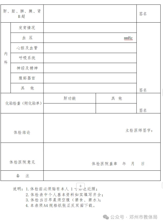注意事项: 附件1 河南省教师资格申请人员体检表