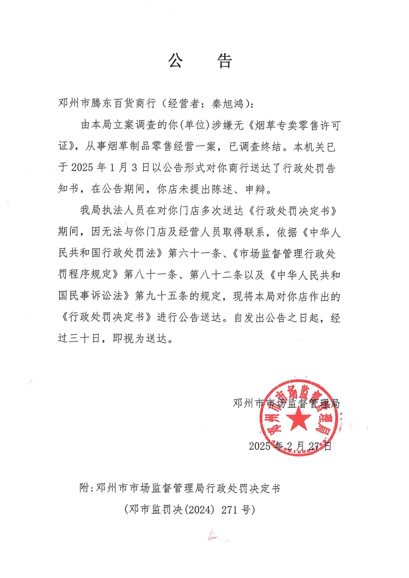 附件:邓州市市场监督管理局行政处罚决定书[邓市监罚决(2024)271号]
