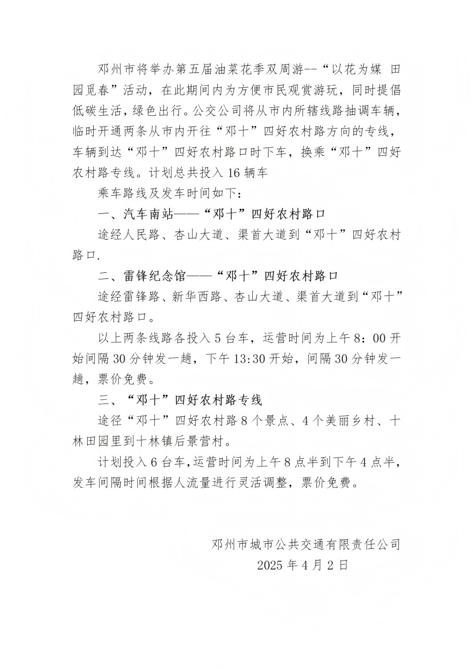 关于开通邓州市第五届油菜花季双周游“以花为媒 田园觅春”活动公交专线方案
