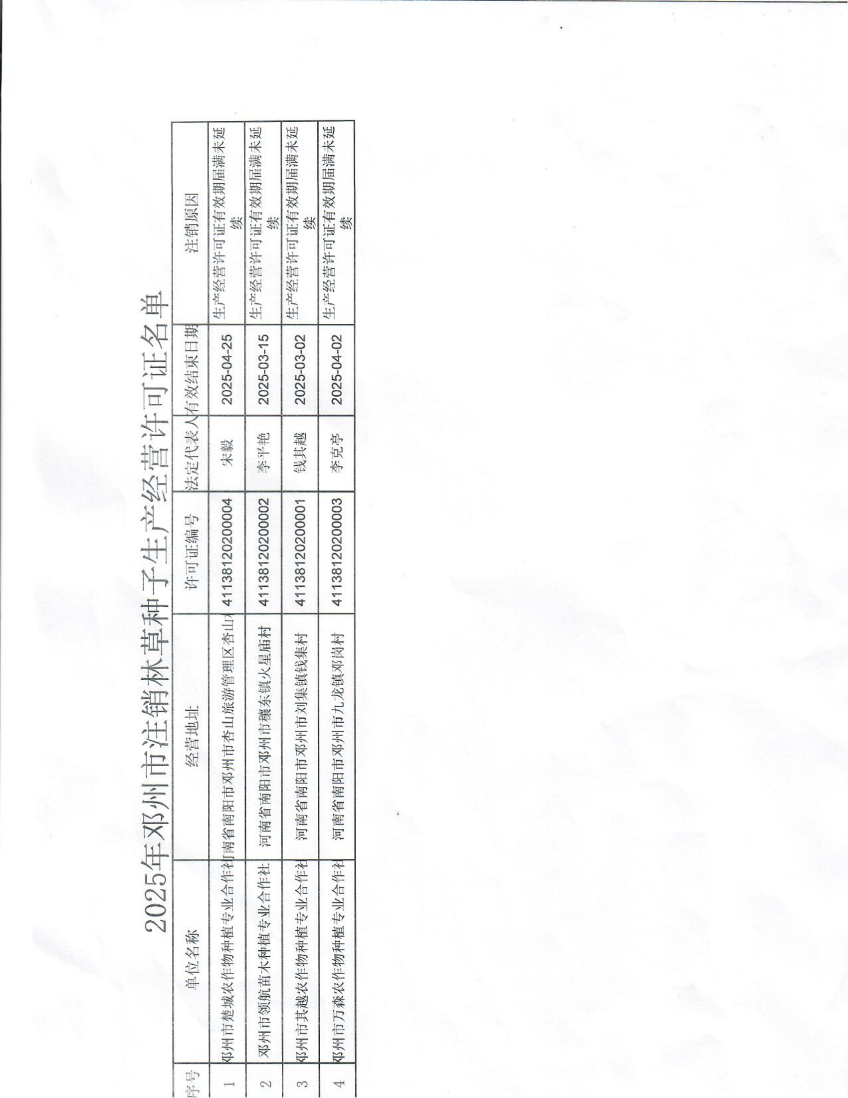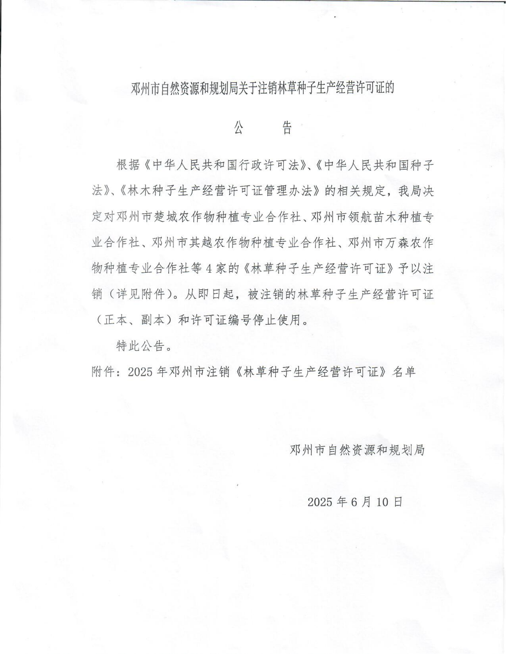 邓州市自然资源和规划局关于注销林草种子生产经营许可证的公告