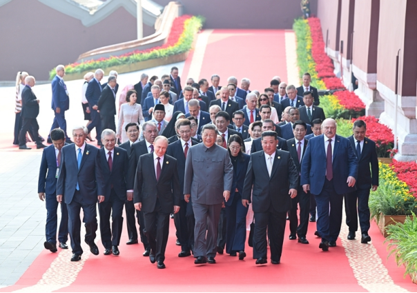 9月3日,纪念中国人民抗日战争暨世界反法西斯战争胜利80周年大会在北京天安门广场隆重举行。这是大会开始前,中共中央总书记、国家主席、中央军委主席习近平同出席大会的外方代表团团长前往天安门城楼。新华社记者 申宏 摄