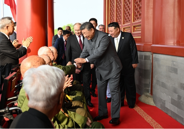 9月3日,纪念中国人民抗日战争暨世界反法西斯战争胜利80周年大会在北京天安门广场隆重举行。这是大会开始前,中共中央总书记、国家主席、中央军委主席习近平同抗战老战士老同志代表亲切握手,向他们表示崇高敬意。新华社记者 燕雁 摄
