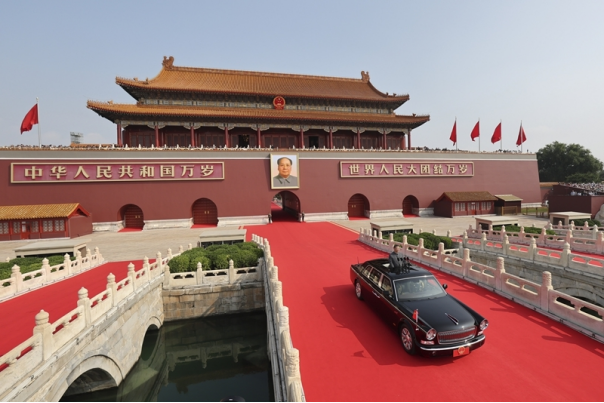 9月3日,纪念中国人民抗日战争暨世界反法西斯战争胜利80周年大会在北京天安门广场隆重举行。中共中央总书记、国家主席、中央军委主席习近平发表重要讲话并检阅受阅部队。这是习近平乘检阅车,经过金水桥,驶上长安街。新华社记者 刘卫兵 摄