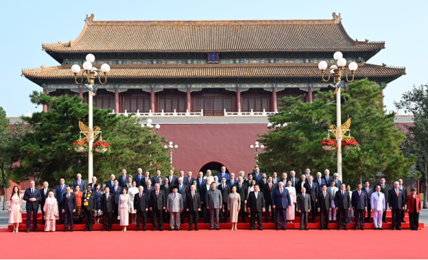 9月3日,纪念中国人民抗日战争暨世界反法西斯战争胜利80周年大会在北京天安门广场隆重举行。大会开始前,中共中央总书记、国家主席、中央军委主席习近平和夫人彭丽媛在端门外广场迎接出席大会的外方代表团团长及其配偶,并同他们合影留念。新华社记者 申宏 摄