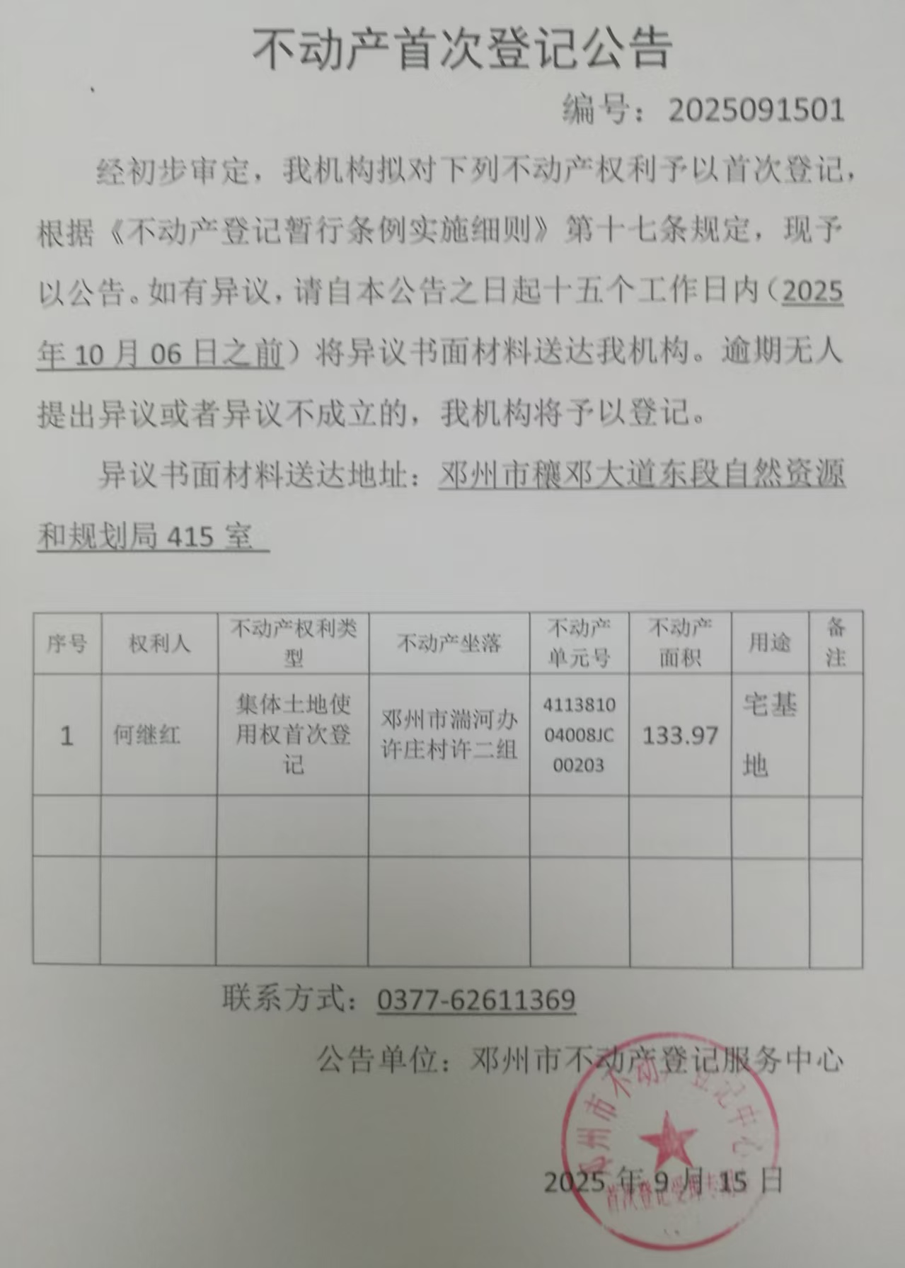 何继红不动产首次登记公告(编号;2025091501)