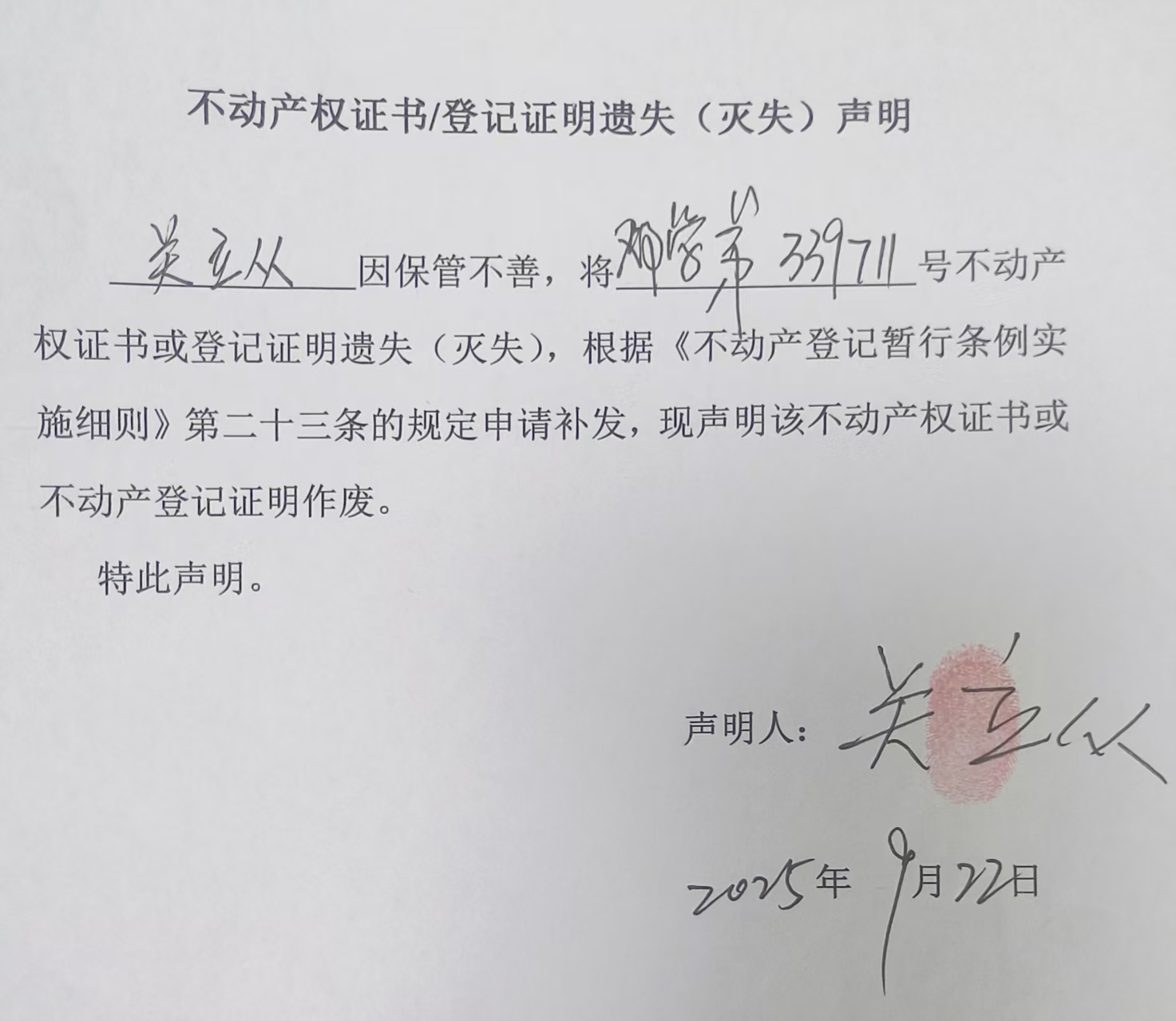 关立从不动产权证书|登记证明遗失(灭失)声明