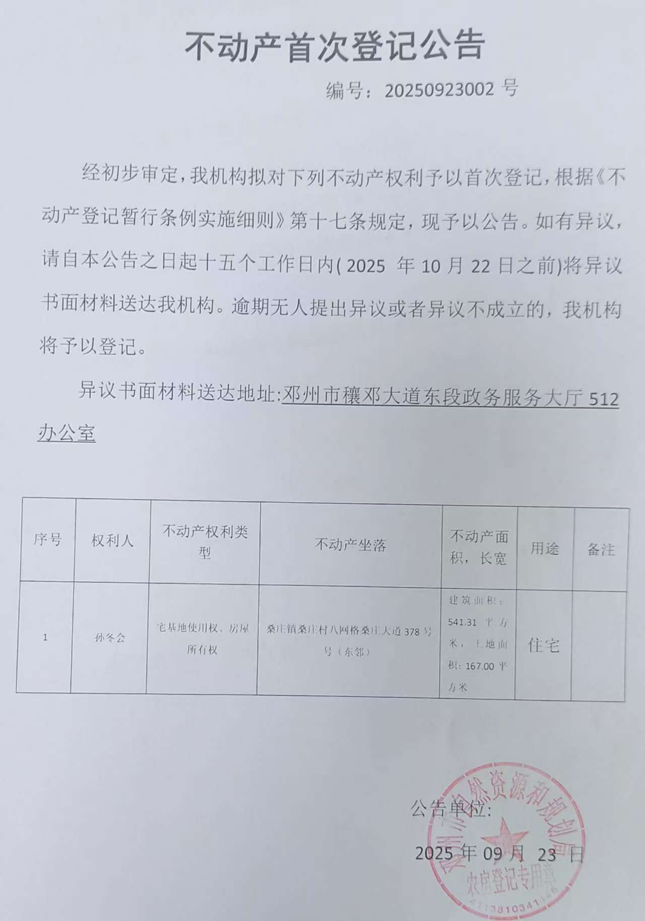 孙冬会不动产首次登记公告(编号;20250923002)