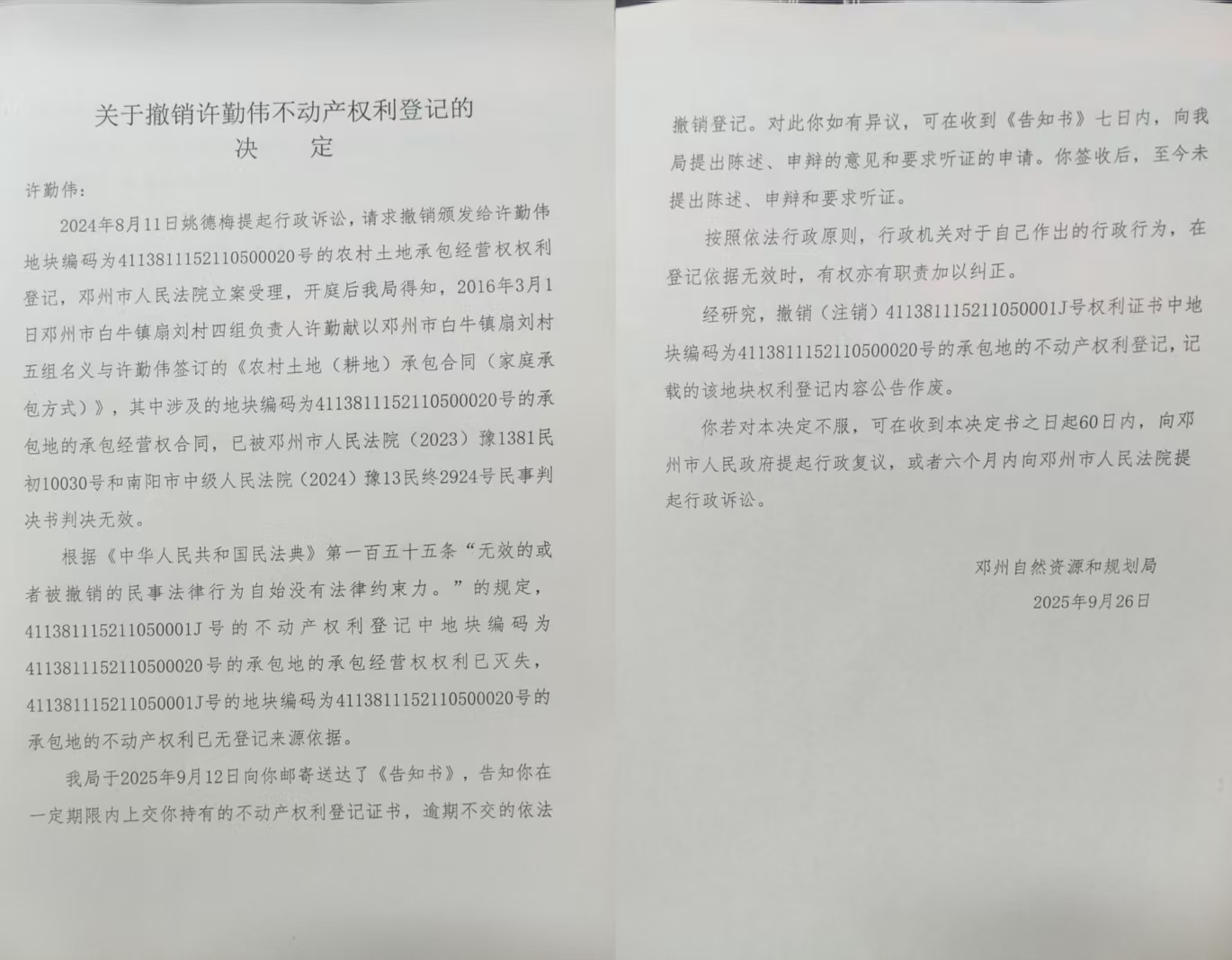 关于撤销许勤伟不动产权利登记的决定