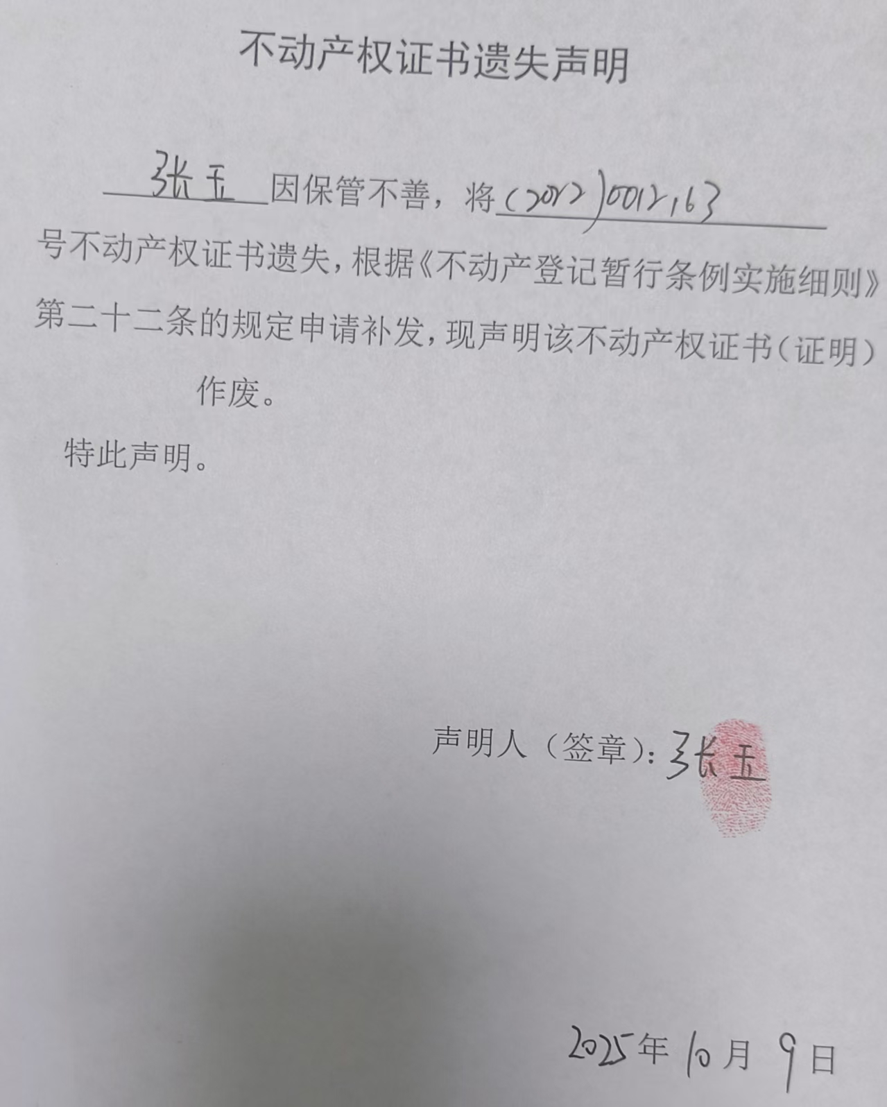 张玉不动产权证书遗失声明